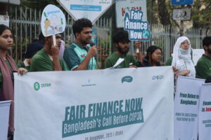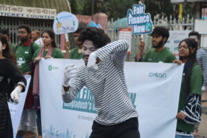 গত শনিবার (৮ নভেম্বর) রাজধানীর শাহবাগে জাতীয় জাদুঘরের সামনে অনুষ্ঠিত এ কর্মসূচিটি পালিত হয় ‘ফেয়ার ফাইন্যান্স নাউ: বাংলাদেশ’স কল বিফোর কপ-৩০’ শিরোনামে। কর্মসূচিটি ফেয়ার ফাইন্যান্স বাংলাদেশ কোয়ালিশন এর সাথে আয়োজন করে অক্সফাম ইন বাংলাদেশ, পার্টিসিপেটরি রিসার্চ অ্যান্ড অ্যাকশন নেটওয়ার্ক এবং ডেমোক্রেটিক বাজেট মুভমেন্ট। এছাড়াও সহযোগী হিসেবে যুক্ত ছিল বিভিন্ন যুব ও কমিউনিটি সংগঠন, প্রচেষ্টা ইয়ুথ ফাউন্ডেশন, সৌহার্দ্য ইয়ুথ ফাউন্ডেশন, আমরাই আগামী এবং শাওন মাইম একাডেমি।